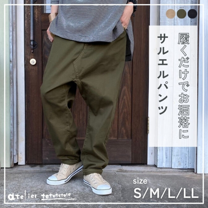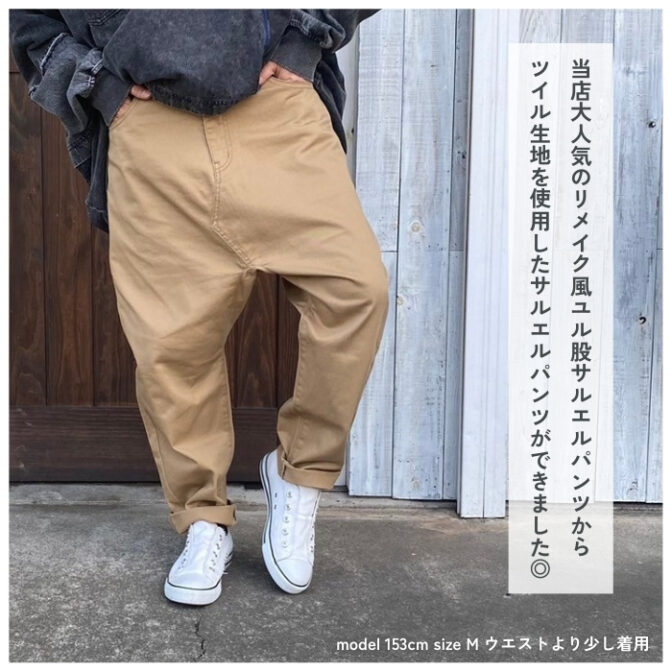 | 特徴 | 当店大人気のリメイク風ユル股サルエルパンツからツイル生地を使用したサルエルパンツができました 気になるお尻・太もも部分はゆったりカバー し、膝から下は細めのデザインで細見えします◎ ウエストを下げて着ていただくと、こなれ感アップ◎ Sサイズは小柄さんにオススメ◎※ブラックのみSサイズがございます。 メンズにもオススメの一枚です |