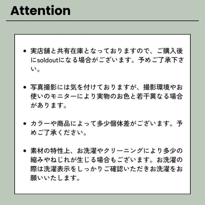 実店舗と共有在庫となっておりますので、ご購入後にsoldoutになる場合がございます。 写真撮影には気を付けておりますが、撮影環境やお使いのモニターにより実物のお色と若干異なる場合があります。 カラーや商品によって多少個体差がございます。予めご了承ください。 素材の特性上、お洗濯やクリーニングにより多少の縮みやねじれが生じる場合もございます。 |