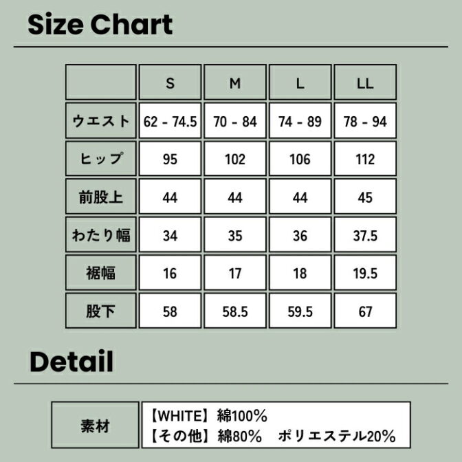 | サイズ | S M L LL ウエスト 62 – 74.5 70 – 84 74 – 89 78 – 94 ヒップ 95 102 106 112 前股上 44 44 44 45 わたり幅 34 35 36 37.5 裾幅 16 17 18 19.5 股下 58 58.5 59.5 67 |